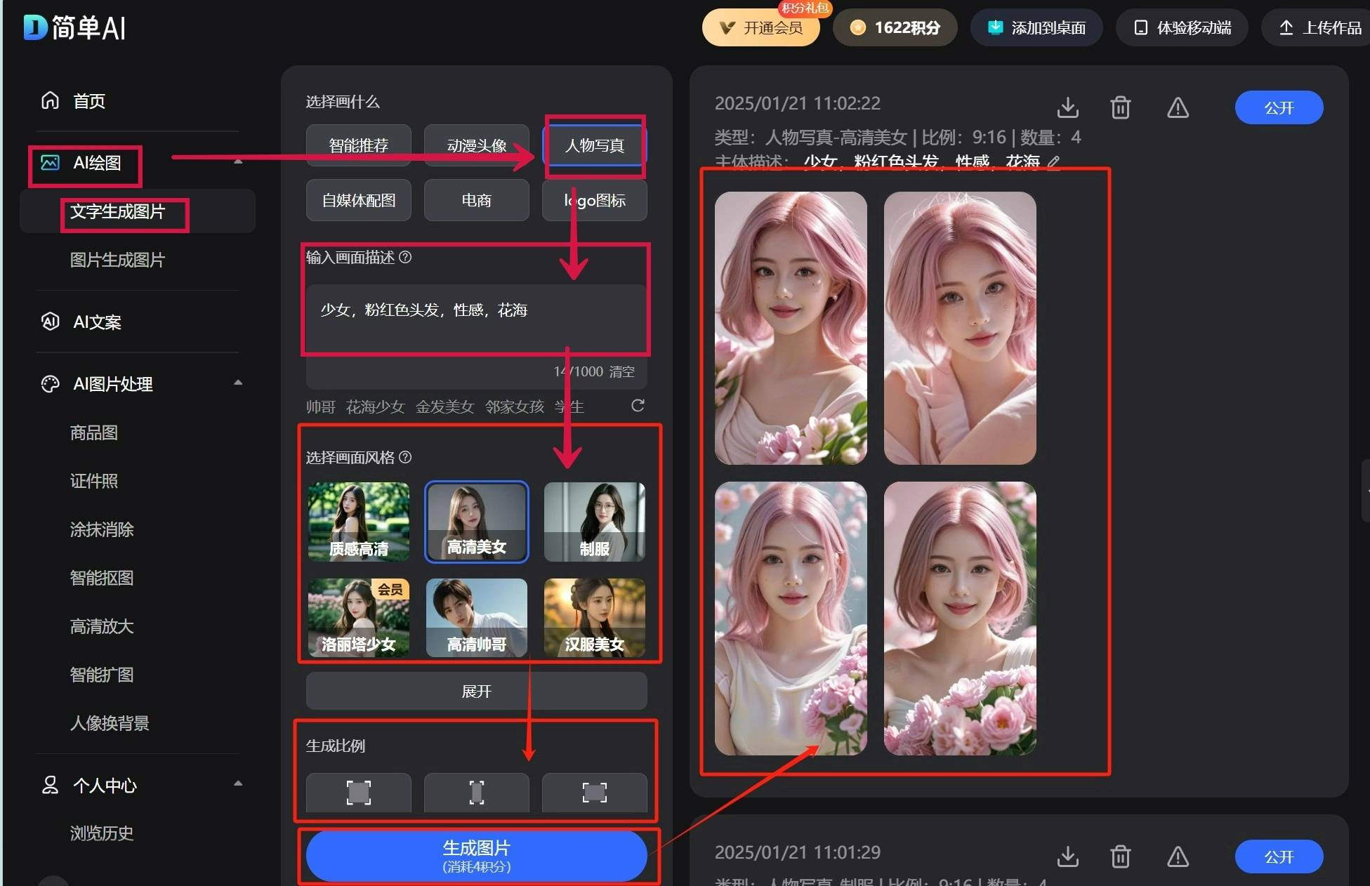 简单AI还有不少适用的AI功能,查看更多第三步:选择画面气概、生成比例及生成数量!